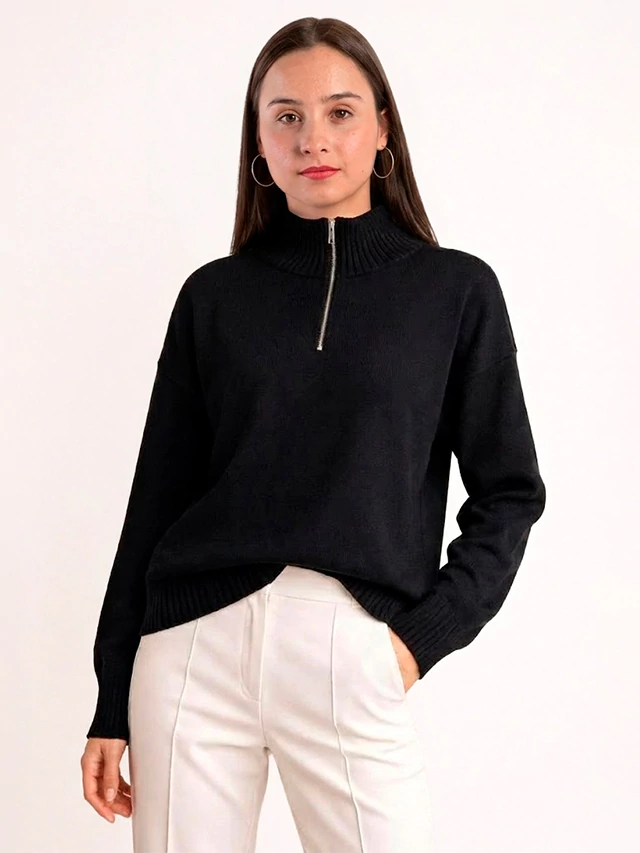 SWEATER CARTER Diseño moderno con cuello medio y cierre metálico, que permite regular la apertura según el gusto.